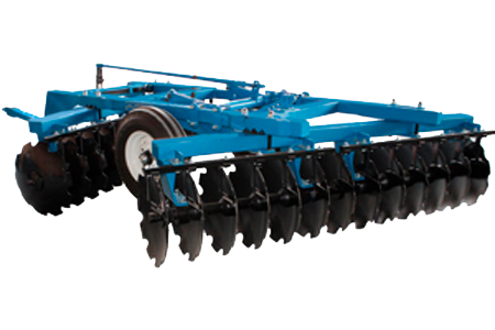 Rastra de 18 discos dentados de 1/4 x 26″; con piston y mangueras hidráulicas; rodado 750 -16 agricola con limpiadores.
